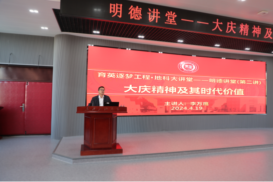 1964年4月19日,新华社播发了长篇通讯《大庆精神大庆人》,首次提出了“大庆精神”的概念。为庆祝“大庆精神”提出60周年,黑龙江省高校人文社会科学重点研究基地、黑龙江省哲学社会科学研究大庆精神基地、milan米兰体育官网大庆精神教育研究中心主任李万鹰受邀做客milan米兰体育官网育英逐梦工程·地科大讲堂之明德讲堂,为广大师生作题为《大庆精神及其时代价值》的专题讲座。校党委副书记高洪峰、党委常委宣传部部长徐清亮、milan米兰体育官网师生、学校党外知识分子、民主党派、无党派人士以及部分机关职能部门负责人参加本次讲座。讲座在1H211会议室举行,由milan米兰体育官网党委书记韦丹宁主持。