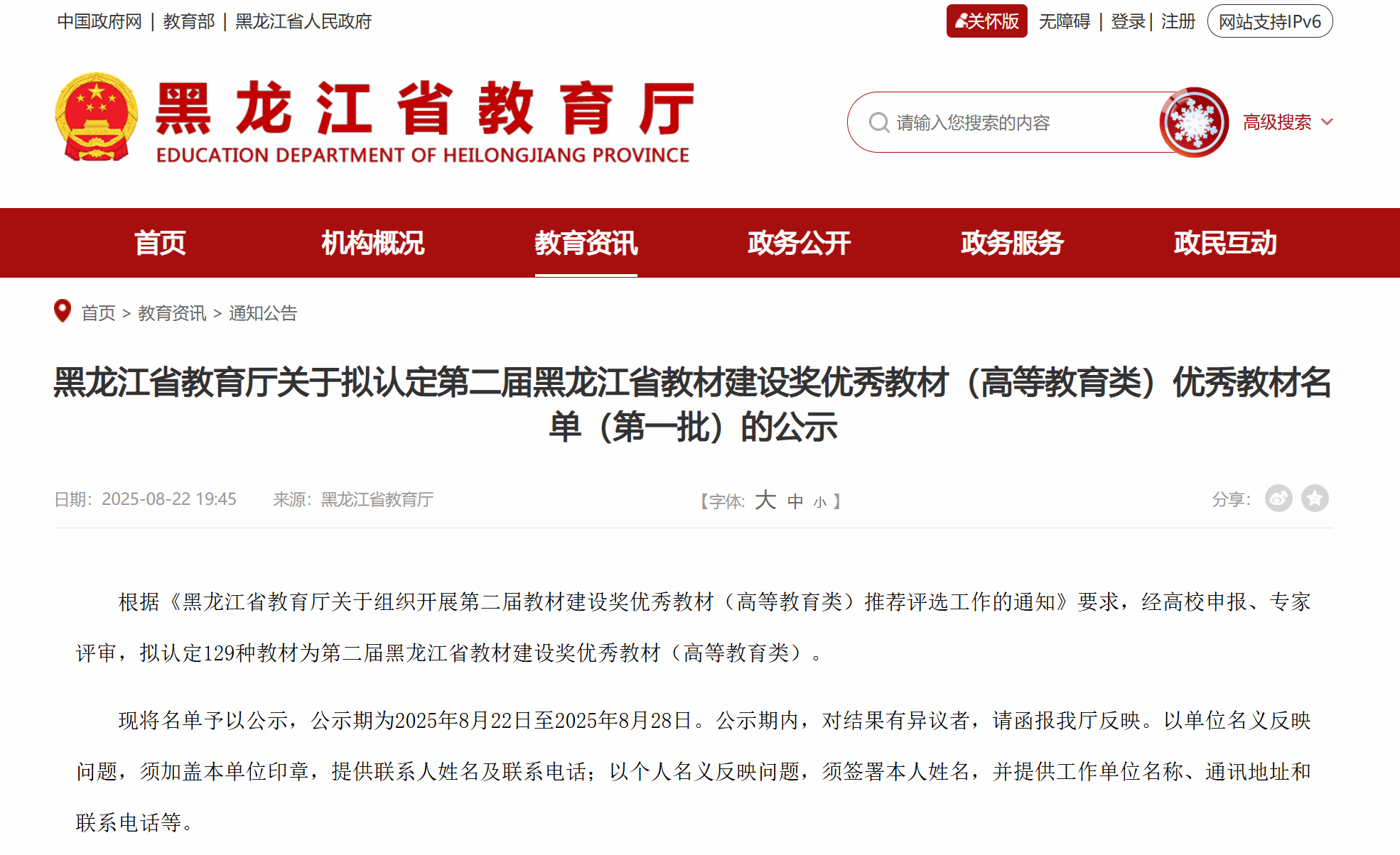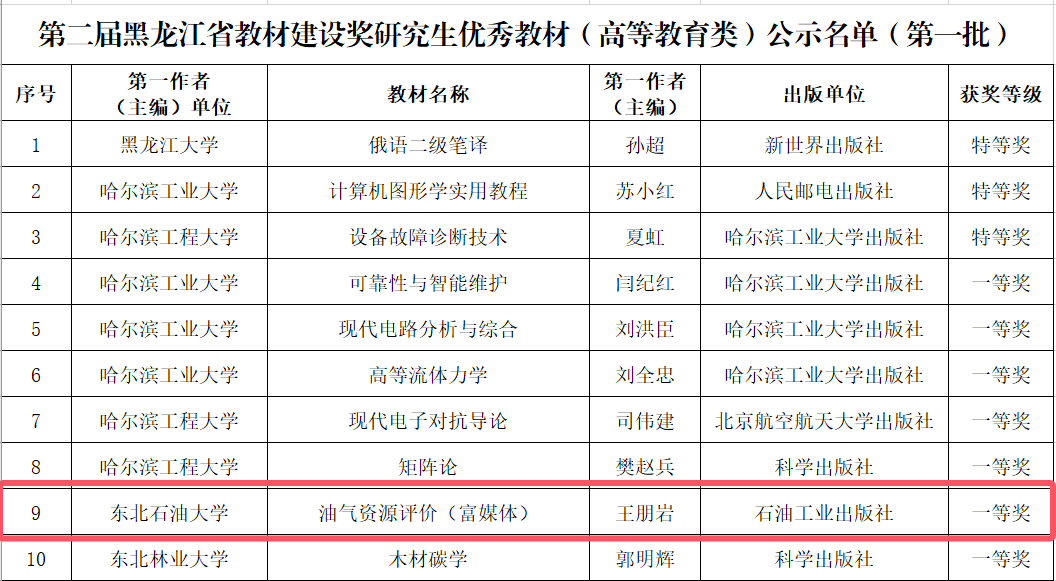 近日,黑龙江省教育厅发布了《关于拟认定第二届黑龙江省教材建设奖优秀教材(高等教育类)名单(第一批)的公示》,经各高校申报、专家严格评审,全省共评选出30部获奖研究生优秀教材(其中特等奖3部、一等奖10部、二等奖17部),milan米兰体育官网有1部教材荣获省级研究生优秀教材一等奖。