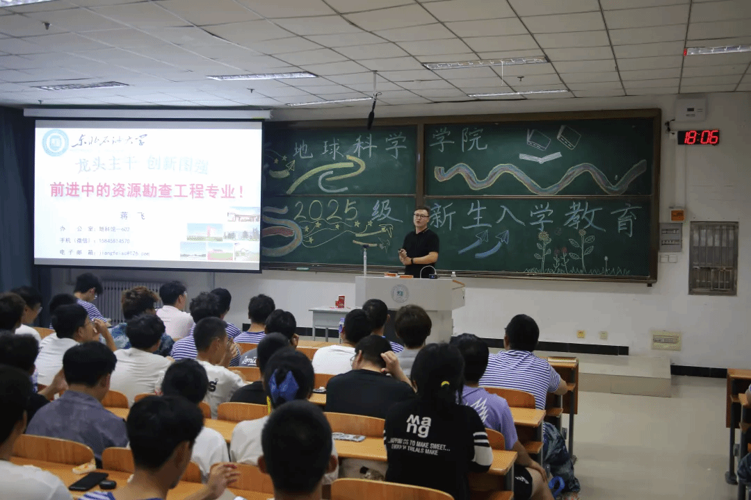 院长孙雨在校史院情专题讲座中,结合学院服务能源勘探开发的历史积淀,激励新生胸怀“国之大者”,将个人理想融入民族复兴伟业,践行“请党放心、强国有我”的青春誓言。