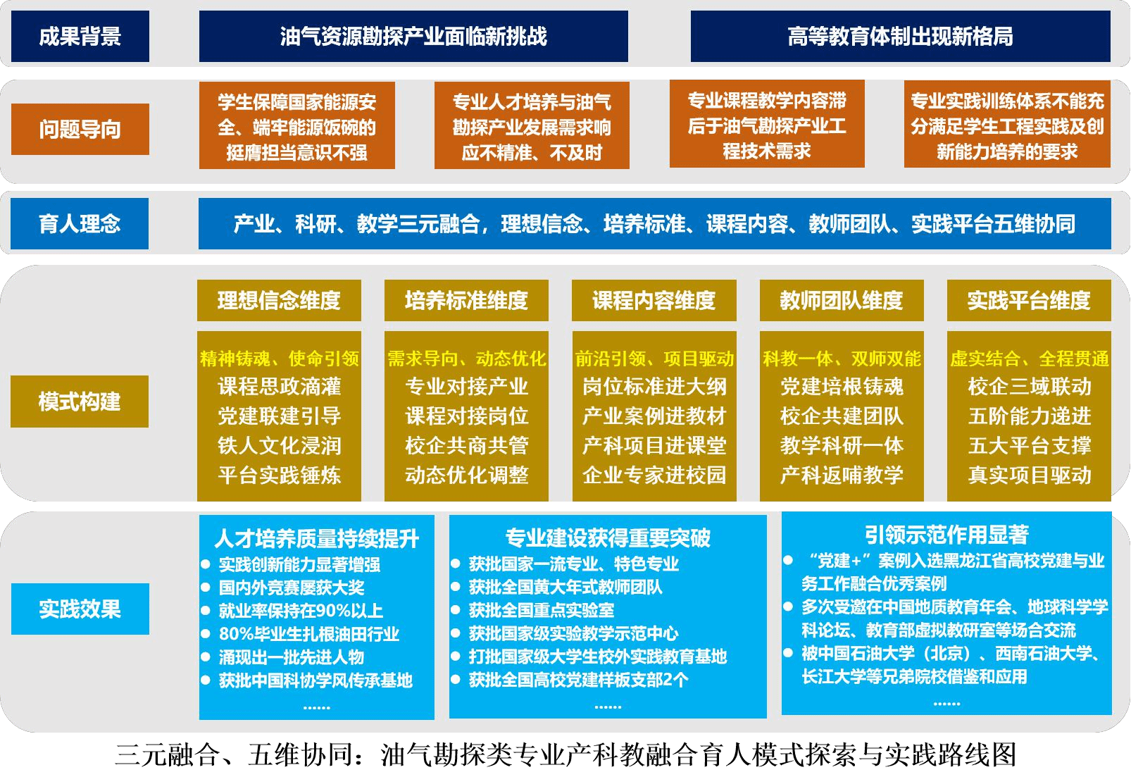面对产业新形势和高等教育新格局,milan米兰体育官网依托油气勘探类优势专业65年的办学积淀,自2010年起以国家特色专业建设和黑龙江省专业综合改革为契机,充分发挥扎根大庆油田的区位优势,聚焦人才培养与产业需求精准对接,紧扣立德树人根本任务,整合校企双方优质资源,创新构建并实践了“三元融合、五维协同”的产科教融合育人新模式。该模式以产业、科研、教学三大要素深度融合为驱动,以理想信念、培养标准、课程内容、教师团队、实践平台五个维度协同共建为路径,系统构建产教融合、科教融汇系统育人新生态,着力培养堪当民族复兴大任、勇担能源强国使命的时代新人,为端牢国家能源饭碗提供坚实人才支撑。
