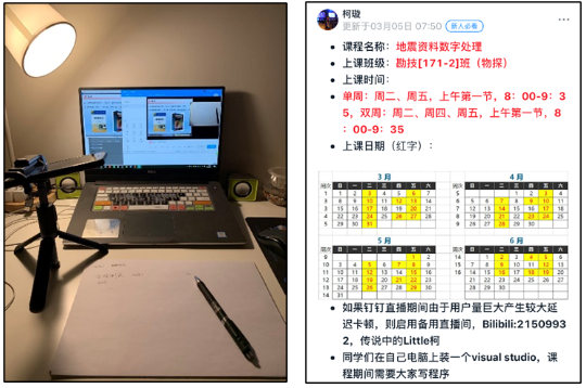 充分准备确保教学万无一失。在春节假期期间即开始搭建多媒体直播设备,测试、严选多个线上直播平台,确立以钉钉直播(专业模式)作为主要在线教学平台,超星学习通为作业评价平台,Bilibili网站为后备直播教学平台的授课方案,并在各平台进行多次测试,确保在开学在线教学高峰期的环境下,教学互动能够顺利执行、万无一失。开课前在QQ、微信、钉钉等多个平台创建班级群组并发布课程公告、在线教学后备方案,确保教学计划传达至每名学生。